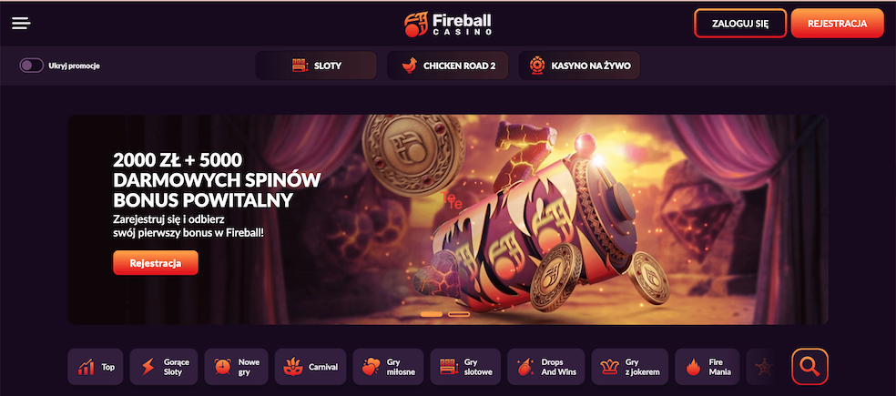 Fireball Casino to nowoczesne kasyno online oferujące bogaty katalog slotów, popularne gry stołowe oraz regularne promocje dla aktywnych użytkowników. Nowi gracze mogą skorzystać z bonusu powitalnego do 5 000 PLN oraz aż 5 000 darmowych spinów, a także brać udział w dodatkowych promocjach i turniejach organizowanych na platformie.