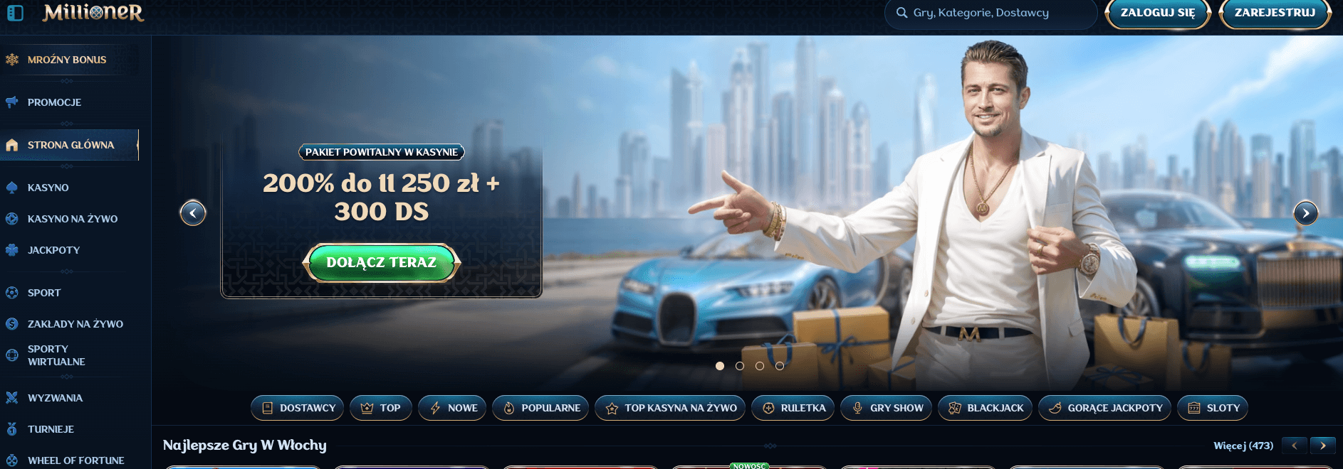 Millioner Casino to nowoczesne kasyno online oferujące szeroki wybór slotów, gier stołowych na żywo oraz rozbudowaną sekcję zakładów sportowych. Nowi gracze mogą skorzystać z pakietu powitalnego obejmującego bonus do 11 250 PLN oraz łącznie 300 darmowych spinów przy pierwszych trzech wpłatach. Platforma regularnie przygotowuje także dodatkowe promocje, w tym cashback, bonusy sportowe oraz oferty dedykowane płatnościom kryptowalutowym.
